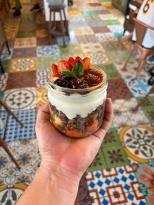 Avena, banano, linaza, tahine, canela, coco, arándanos, nibs de cacao, miel acompañado de leche de almendras.